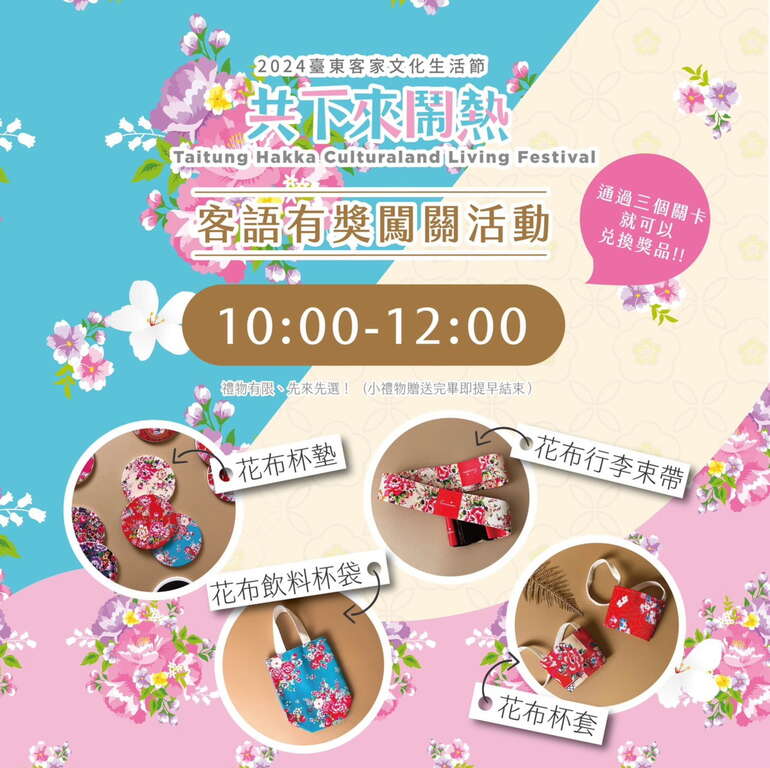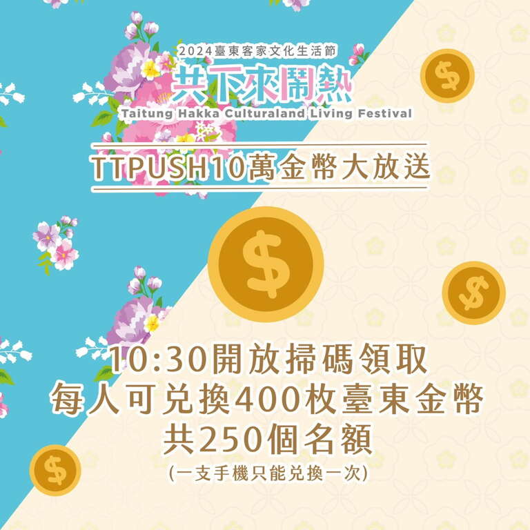 台东县政府表示,客家文化的推动与保存,一直是县府施政的重点目标,希望藉由此次活动传承客家文化、推广客家语言及艺文,提升客语社群活力,活动将於上午9:50开始,也邀请在地客家表演团体,包括小丑爸爸欢乐秀、台东县客家妇女合唱团、台东县六堆同乡会舞蹈表演、悦舞儿童舞蹈团、铁道村晨运社、德高老人会三大调、瑞源客家韵艺团及客家创作歌手饶棣华等团队表演,周边还有客家独特文化擂茶体验、米苔目DIY、蓝染DIY及客语闯关等单元活动,另外,10:30起将再发送 10 万枚 TTPUSH 台东金币,每人400枚,共250个名额。