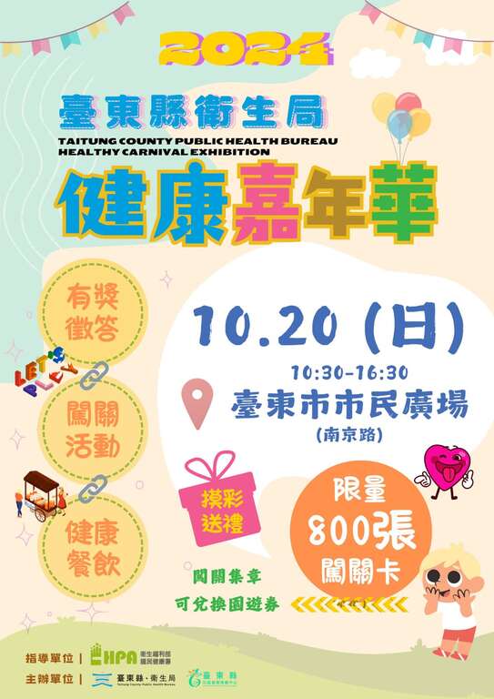就在这个礼拜天,台东县政府主办的2024台东健康嘉年华活动,即将於20日上午10点30分起在台东市民广场(南京路)热闹登场,首创以「健康」为主题的活动,展现保健科业务推动成果及各项宣导,欢迎县民大手牵小手全家踊跃一起来闯关,欢度周末假日。