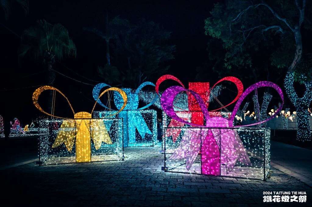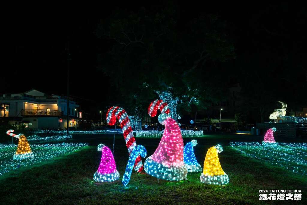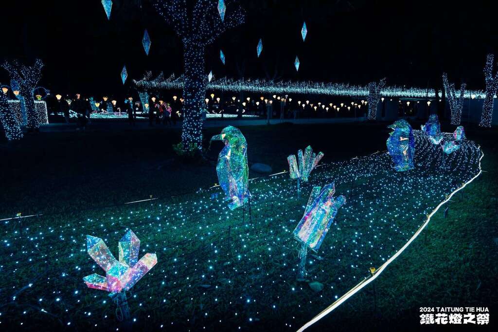 台东县政府交观处表示,新主题【极地童话】以梦幻极地世界为背景,结合冰雪与童话故事元素,除在铁花市集人行步道规划绚丽「浪漫天幕」,步道两端也设置「耶诞礼物盒」和「音乐许愿帽」为亮点入口意象,伴随坐落市集旁草地区高7米的「冰雪白熊」,和璀璨「冰晶企鹅」共同迎接到访游客,另一侧还有可爱的耶诞帽及拐杖糖,让人仿佛置身耶诞童话中。