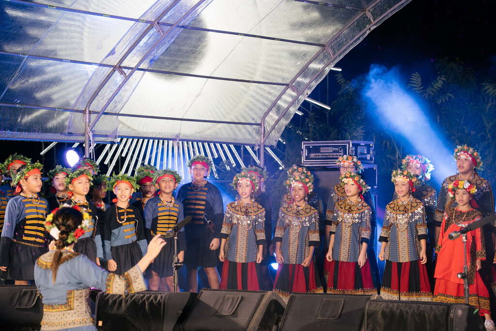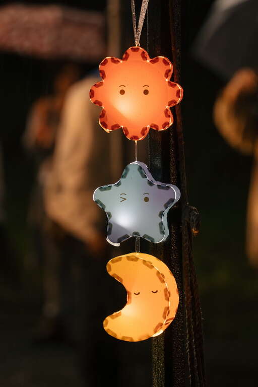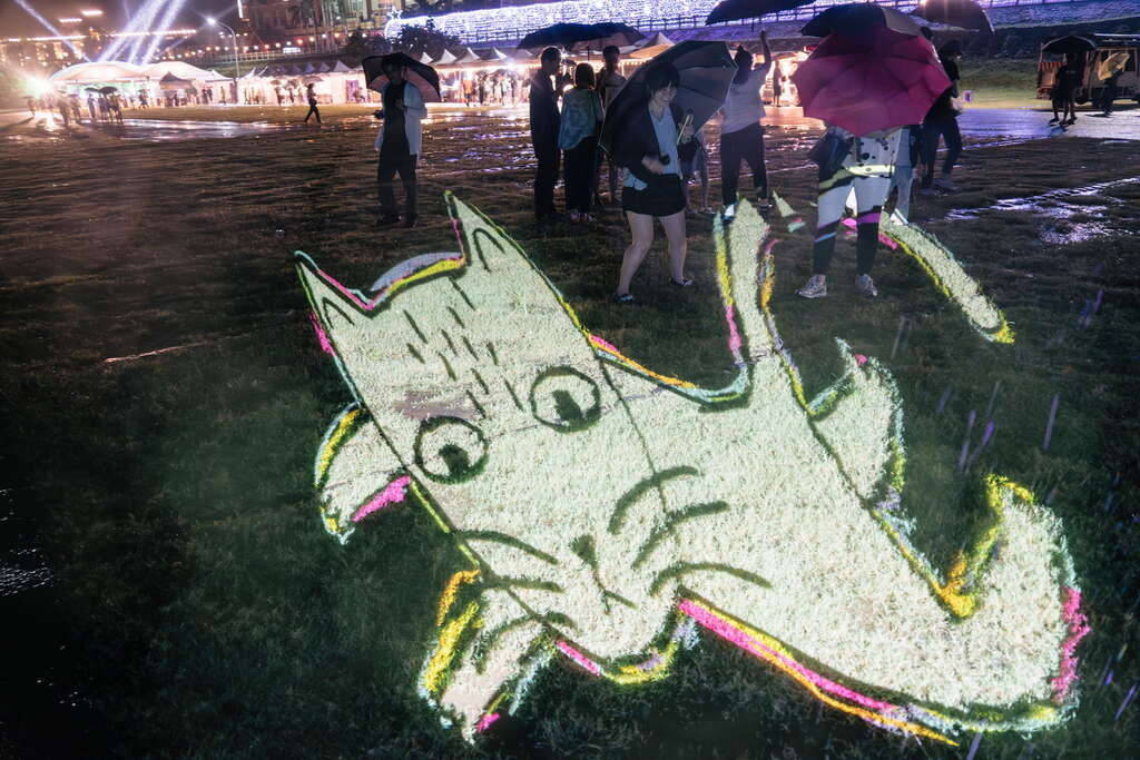 另外,原民艺术家伊佑葛照的作品《温暖的⽅向》,作品以蜿蜒曲折的树藤塑造一个温暖的光源,如同⼈们喜爱在天冷时去泡温泉般,温暖的起点成为万物移动的⽅向、巴西艺术家 VJ 舒瓦夫(VJ Suave),与台东在地60位学生共创《太空漫游》与《星空动物园》两大作品,以孩子们丰富的想像力打造勇男桥下的星空宇宙、丁尺建筑师事务所 x 叶广⼯作室所呈现的《山海野台》 以常民物件-金属椅凳,搭了一座地景舞台:椅凳堆叠出两道弧形墙体,如同地壳板块运动隆起的⼭脉,也如波涛汹涌的海浪,暗涌的水雾犹若温泉地热,是属於知本的野台迷幻效果、吴佳勳x凡京设计所创作的作品《光浴.光遇》在柔软的草地上呈现插画人形於自然沐浴的悠游自得、而原有机制的作品《落雨》则以光模拟雨滴落入水面的画面,圈圈涟漪在空间中扩散,映射出台东日月星辰的光影变幻。