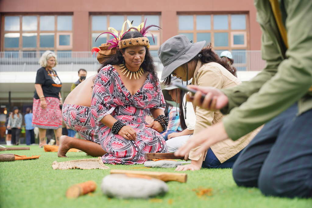 昨(20)日打头阵的工作坊带领民众一窥菲律宾Cordillera地区伊戈洛特(Igorot)族群传统歌舞,现场有近十位国立台东大学附属体育中学师生,预约体验以身体与竹乐器共鸣,除了学习多元文化,更藉此获得更宽广的海洋国际视野。下午的活动在大溪地祭司的仪式後展开,民众学习马奥希(Maohi)族群的树皮制作及歌谣;树皮布与大溪地人的生老病死息息相关,在重要仪式如婚礼中是必需的文化物质,敲打树皮时需心怀爱与感谢,因此这不仅是一项工艺,也是维持与环境关系的一种生活实践。