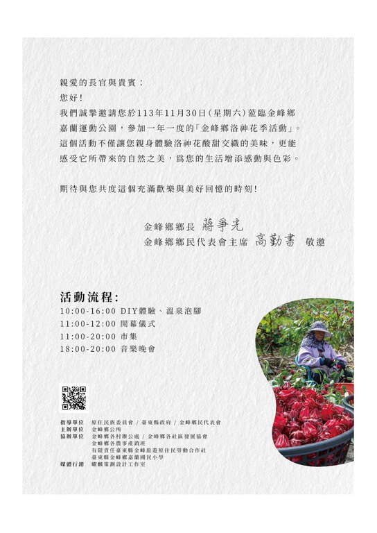 113年11月30日「金峰乡洛神花聚 即将登场!体验丰富活动共享原民风情摇滚之夜」