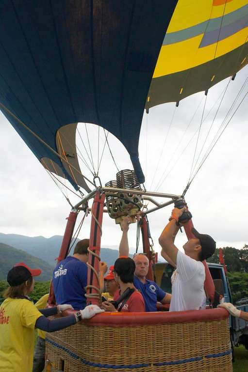 2013台湾国际热气球嘉年华开幕以来,吸引许多国内外媒体争相报导,今(8)日,包括中视、国家地理频道、自由时报、中国时报及世界新闻台等媒体也前来拍摄,虽然清晨的云层多了点,但是气流稳定非常适合飞行,在确认完测风球的速度及方向後,现场立即展起一颗颗热气球,1.2.3.4.5...数一数今天自由飞表演的热气球一共飞起了9颗,加上气流稳定,这些热气球高挂在鹿野天空,呈现一幅难得的壮观场面。