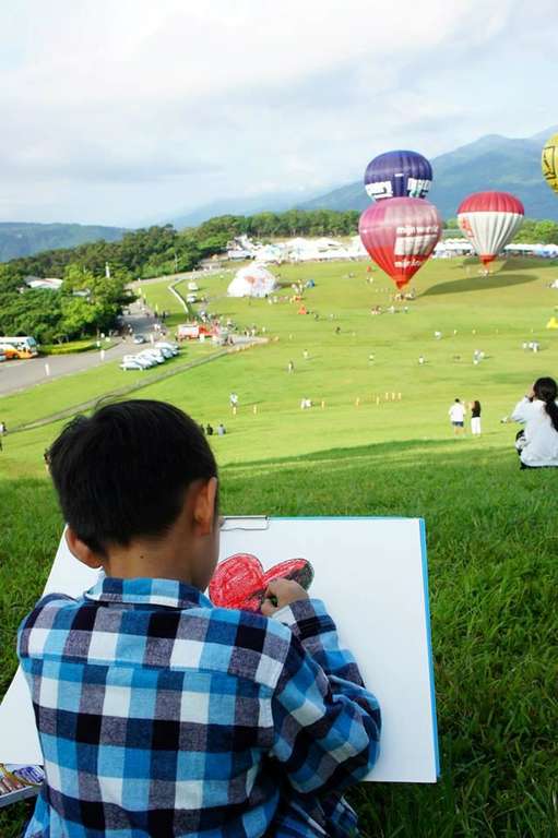 另外,由教育处主办的「2013国际热气球嘉年华学生绘画比赛」今天清晨也在高台眺望亭举行,总共吸引110位小朋友报名参与,只见这些小朋友个个创意十足,眼神专注的将所看到热气球画进纸张里,最吸引小朋友目光的莫过於造型讨喜的愤怒鸟、爱心球及蛋糕造型球,同时这些球也成为今日绘画内容的大热门。