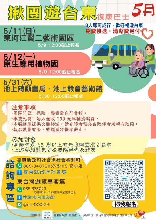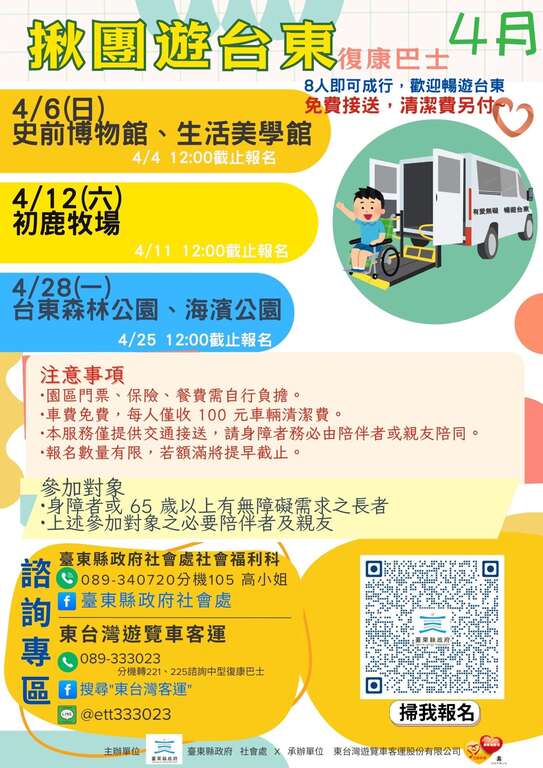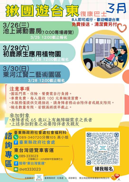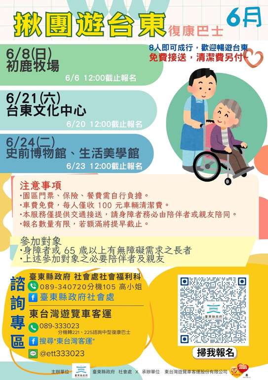 「揪团游台东」相关讯息将公布於县府社会处Facebook粉丝专页、东台湾客运Facebook粉丝专页及县府社会处官网公告,欲参加者请填写报名网址,欢迎有兴趣的民众定期关注最新消息。身心障碍团体若於台东县内办理旅游、活动或会议需交通协助,可联系社会处社会福利科谘询申请(联系窗口:089-340720#105,高社工),让所有人都能安心畅游台东,体验友善无碍的旅程。