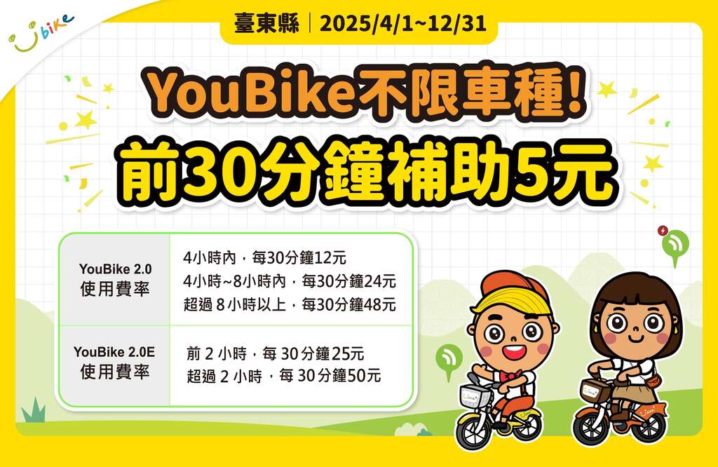 为推广绿色运输、提升公共自行车使用率,台东县政府自推动YouBike补助以来成效显着,深受民众好评。为持续鼓励民众养成低碳出行习惯,县政府宣布将YouBike补助延长至今年12月31日,并同步调整补助内容,以优化民众骑乘体验。自即日起,无论是YouBike 2.0或YouBike 2.0E,前30分钟骑乘皆可享5元补助,相当於每趟直接现省5元,让骑乘更经济实惠。此外,YouBike 2.0E的费率将恢复为前两小时内,每30分钟25元,请民众留意费率变动。