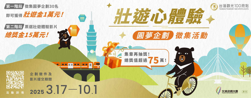 交通部观光署携手全台22个县市与各国家风景区管理处,推动「台湾观光100亮点」,刻正委托天下杂志股份有限公司举办「台湾观光100亮点—壮游心体验」圆梦企划徵集活动,邀请全国民众规划动人且深刻的壮游旅程,以永续旅游概念,旅行「台湾观光100亮点」及周边景点;114年5月11日前投稿壮游体验企划,就有机会获得壮游金新台币(下同)1万元,完成壮游圆梦之旅,拍摄壮游影音最高可再获得奖金5万元。