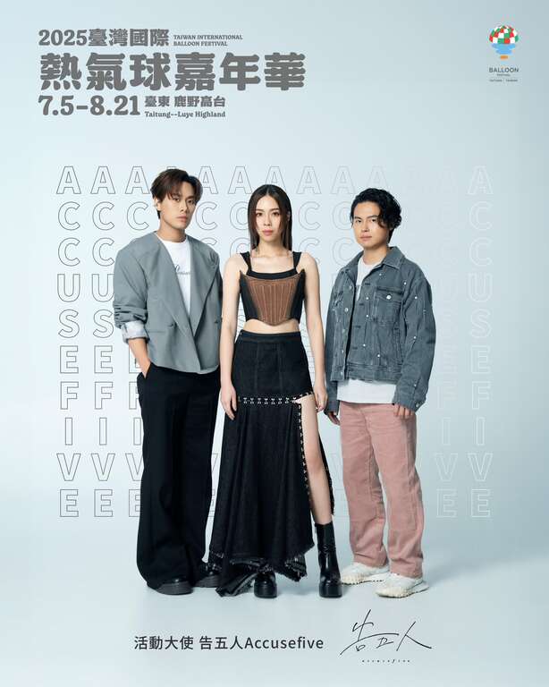 台东县政府表示,超人气乐团「告五人」自2020年在鹿野高台2500英尺高空初体验搭乘热气球之後,睽违五年将重返鹿野高台并担任热气球活动大使,且将於5月12日花博公园举办的2025台湾国际热气球嘉年华记者会中,亲自现身宣布今年各场次热气球光雕音乐会演出阵容,连续八场的热气球光雕音乐会,除了热气球及无人机的联合展演之外,更扩大成为众星云集的热气球光雕音乐会。