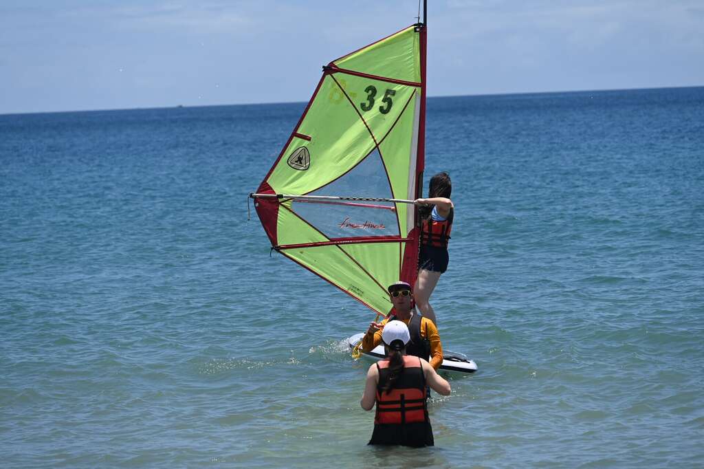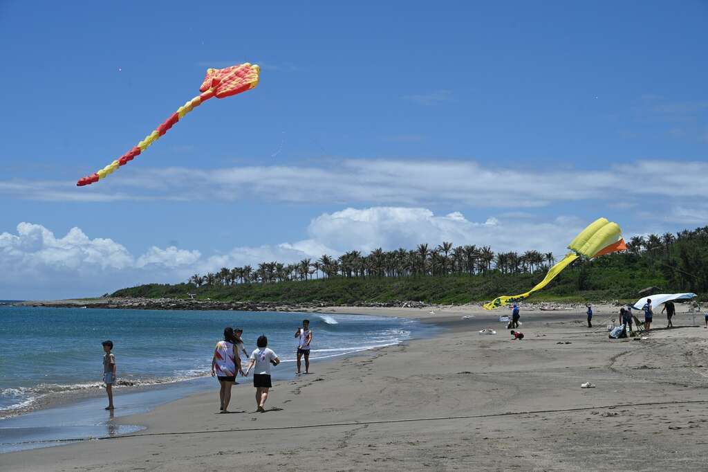 台东县政府表示,下午1点起,有多项沙滩与水域体验活动展开,包括SUP龙舟趣味竞赛、亲子沙雕体验、风浪板体验等,适合亲子同乐、全民参与,还有以「马达加斯加」为主题的大型风筝展演,巨型动物风筝如长颈鹿、狮子、金刚等陆续升空,成为拍照打卡热点,充满夏日热情。