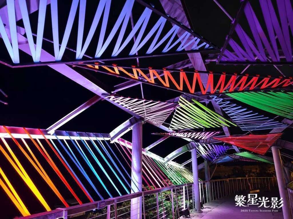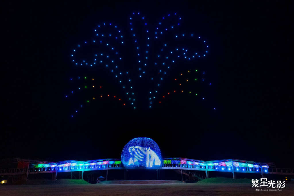 此次展览核心作品「繁星光影」,以直径13公尺的光之球体为中心,搭配超过万颗点光源及两侧光织廊道,形成如星河般流动的奇幻场景。每晚7点至10点,每30分钟一场声光动画秀动态展演吸引游客驻足,开幕日更有无人机编队表演点亮夜空,为台东夜间观光树立全新标竿。
