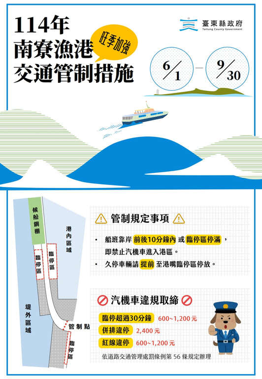 随着暑假旅游旺季即将来临,绿岛的旅游人潮也将逐渐涌现,台东县政府为促进绿岛南寮渔港交通顺畅并提升观光形象,今年将再度与台东县警察局携手合作,6月1日至9月30日启动「旺季加强管制措施」,管制船班抵达前後10分钟的港口车辆出入,将港区道路空间留给进出港口的步行游客,创造安全的人行空间。管制期间若不听劝导、违规停车,可依法处新台币600~2400元罚锾。