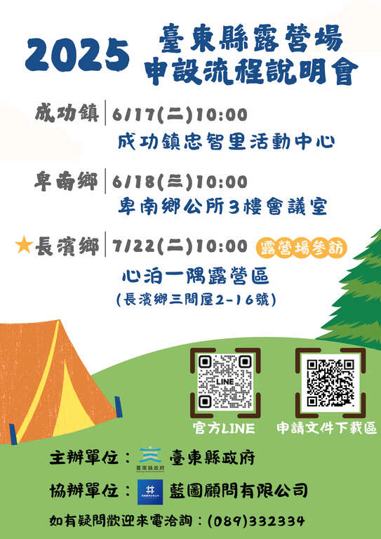有监於露营活动已成为广受国人喜爱的新型态热门户外游憩活动之一,为辅导县内微型露营场合法化,台东县政府交通及观光发展处将於6月17、18日及7月22日分别在成功镇忠智里活动中心、卑南乡公所三楼会议室及长滨乡心泊一隅露营区三个地点办理「台东县露营场申设流程说明会」,其中长滨乡场次结合合法露营场参访及业者经验交流活动,欢迎对露营场经营有兴趣的民众及业者自由参加。