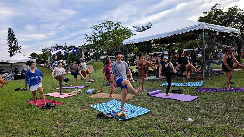 今日开幕式由艺术团体「游墨之间」带来墨笔与舞蹈交织的表演,展现静动之间的艺术美感,饶县长也亲笔题写祝福字句,为活动揭开序幕。此次活动涵盖「忘忧舞台」、「纾压工作坊」、「心灵市集」三大主轴,首日由在地瑜珈老师 Monkey带领的「森呼吸草地瑜珈」吸引近百人参加,傍晚时段Jackal Mei与YILE LIN林以乐现场音乐演出,大小朋友铺上野餐垫,在森林中共享疗癒时光。