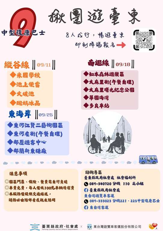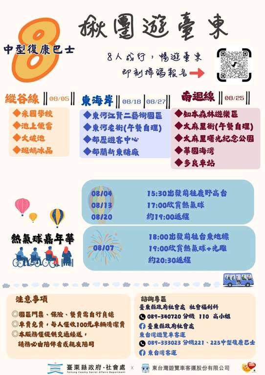 社会处长陈淑兰进一步说明,「揪团游台东」主要服务对象为设籍台东县、年满65岁以上长者,或有交通辅具使用需求之身心障碍者,每团8人(含陪伴者)即可报名参加。中型复康巴士皆配备升降设备,供轮椅使用者安全上下车,参与者仅需负担100元清洁费,其他交通费用全免;需特别留意,活动不含导览、购票及餐饮,相关园区门票、保险及餐费需自理。此外,自7月起陆续推出东海岸、南回线及纵谷线三大一日游路线,让民众可依喜好选择旅游区域,各路线皆提供完整交通支援,旅程自在又便利。