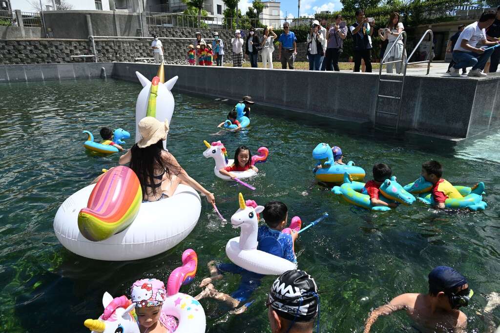 活动开场之後,小朋友们带着可爱的造型游泳圈,迫不及待的欢喜下水。王小弟弟说,第一次来涌泉公园玩,看到清澈的水池里还有鱼、虾、藻类等,觉得很惊奇很好玩,以後每个假日都要请爸爸妈妈带来玩。