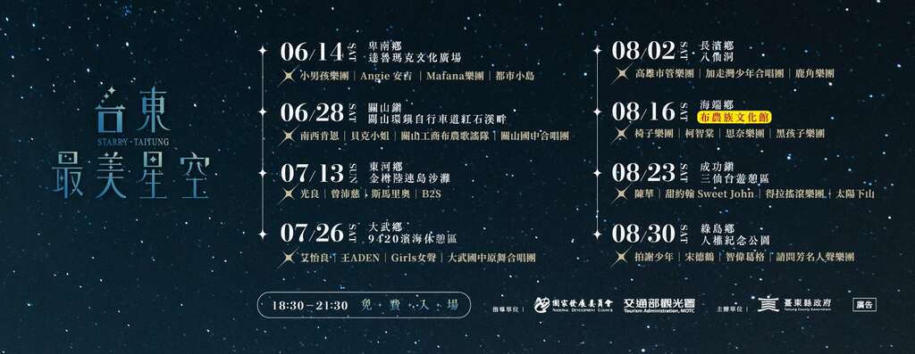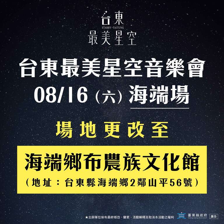 2025年最受期待的夏季音乐盛事—「台东最美星空音乐会」将於16日晚间6点30分,在台东县海端乡布农族文化馆闪耀登场!台东县政府表示,原订场地为海端乡雾鹿国小利稻分校,因应近期豪雨过後,考量山区道路夜间行驶安全,经过慎重评估,决定将活动场地进行更换,希望让大家能在便利且舒适的环境中,尽情享受音乐与星空的美好盛宴。
