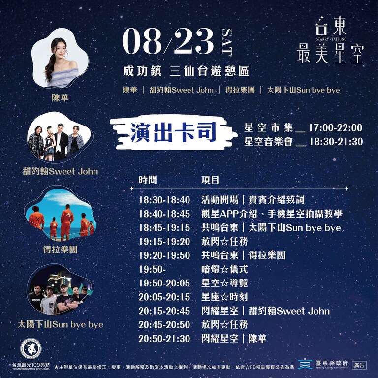 「2025年台东最美星空音乐会」-成功场,将於本周六(8月23日)晚间18:30在成功镇三仙台游憩区浪漫登场!,将邀请创作歌手【陈华】、入围第29届金曲奖最佳乐团【甜约翰Sweet John】、清新且富生命力的独立乐团【得拉乐团】,以及在地乐团【太阳下山】轮番登台开唱,在以星辰为幕、海浪声相伴的三仙台,展开一场星空与乐章交织的音乐飨宴。