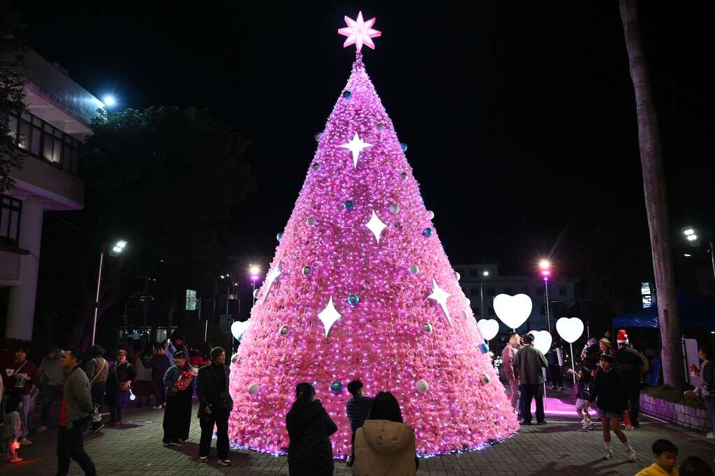 为迎接2025年圣诞佳节,台东县政府於县府广场设置了象徵爱与温暖的粉红色圣诞树,增添节庆氛围,并於3日举行点灯仪式,吸引三百多位县民与县府同仁参加,许多家长也带着孩子共襄盛举。县长饶庆铃表示,今年以能安定人心的「贝克·米勒粉红」为主色调,传达爱与希望的力量,圣诞树上特别设计铲子装饰,向前往花莲光复协助救灾与复原的「铲子超人」致敬,并祝愿新的一年平安顺遂,也诚挚邀请各地民众来台东泡温泉、欢度圣诞与跨年。