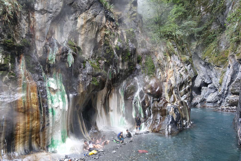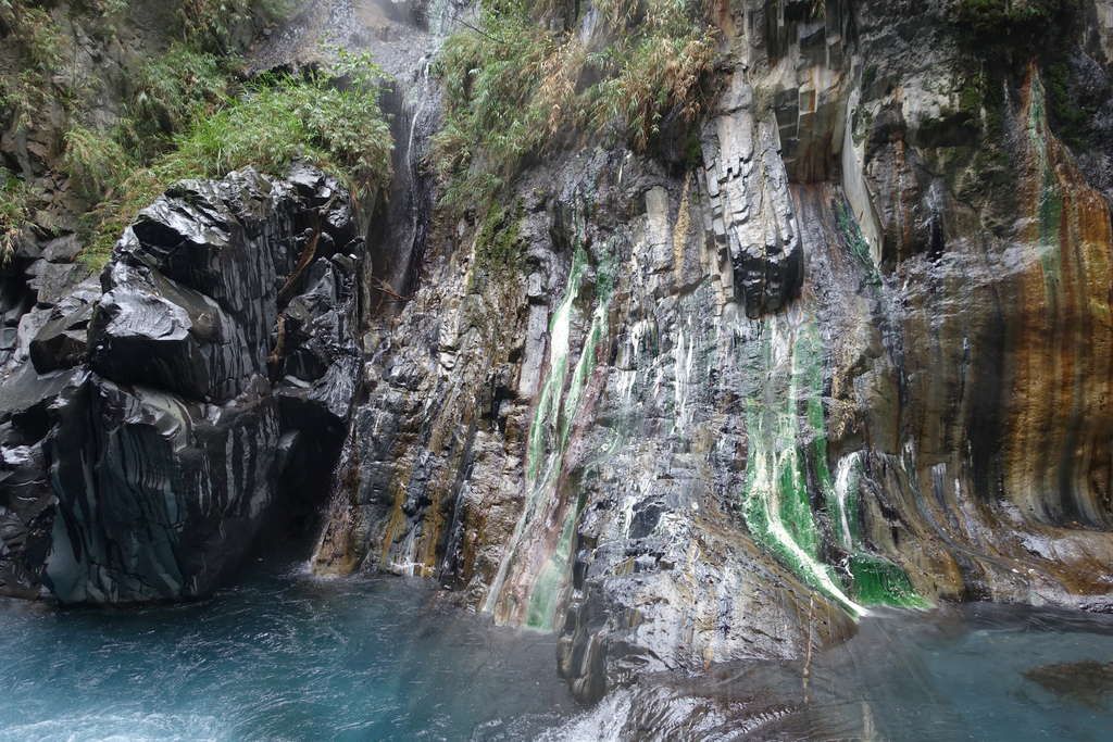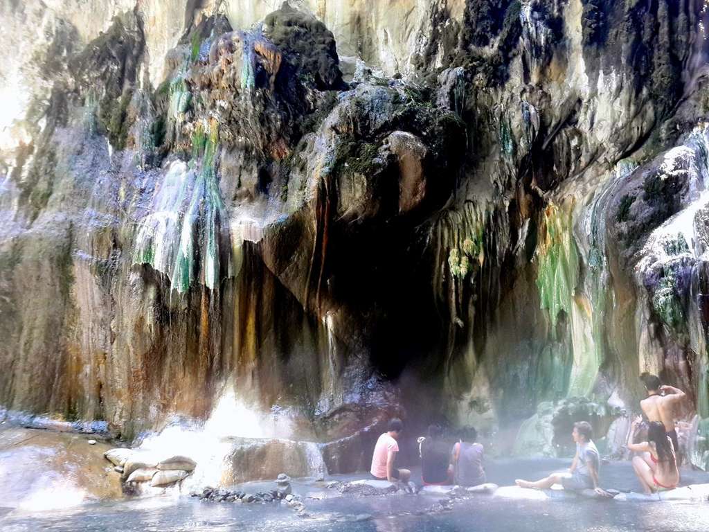 山壁上凝結了碳酸鈣結晶,加上附著在礦物上的翠綠溫泉藻形成的色彩,如同翡翠鑄成的岩壁,是此地最著名的景觀。