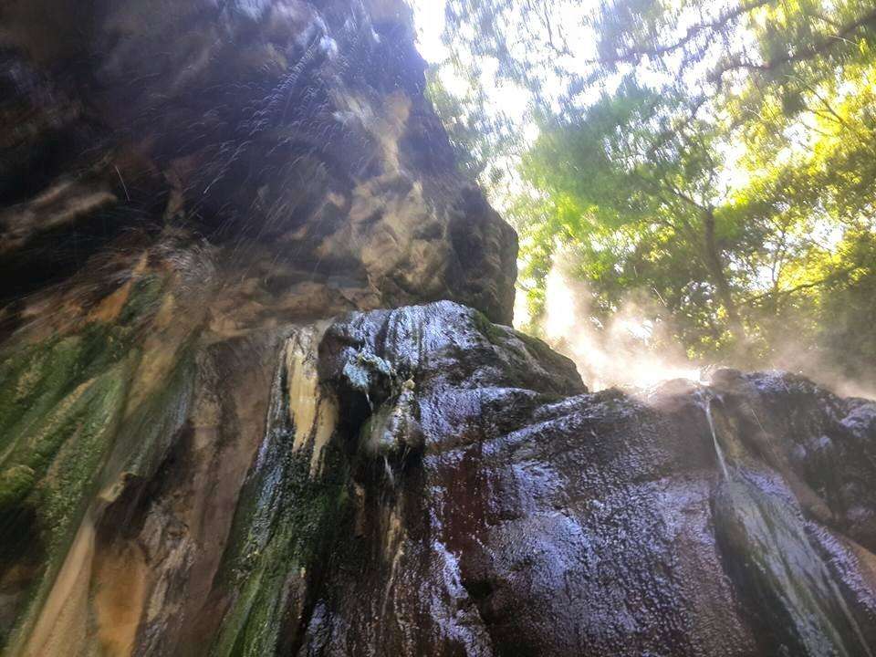 栗松溫泉,有著從山壁傾流而下的泉水瀑布,水溫45-65℃左右,屬於弱鹼性的碳酸氫鈉泉。