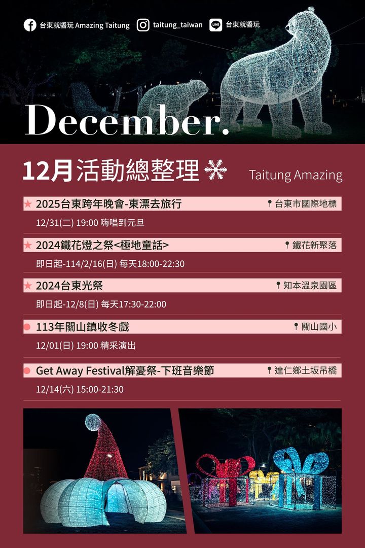 【十二月活動總整理】感受冬日台東的繽紛與熱情 12月來台東,活動精彩不間斷! 無論是夢幻的光雕裝置、強強滾的跨年卡司 還是季節限定的關山收冬戲都等你來體驗 本月必逛活動推薦: ️ 2025台東跨年晚會-東漂去旅行 ️ 2024鐵花燈之祭-極地童話 ️ 2024台東光祭 ️ 113年關山鎮收冬戲 ️ Get Away Festival解憂祭-下班音樂節 ️ 南迴藝術季藝術品持續展示中 趁著冬日微涼,來台東探索更多不一樣的精彩! 快留言 @朋友,約起來一起出發吧! #台東 #知本 #跨年 #活動 #台東景點 #鐵花燈之祭 #台東光祭 #關山收冬戲 #下班音樂節 - 2024-11-22