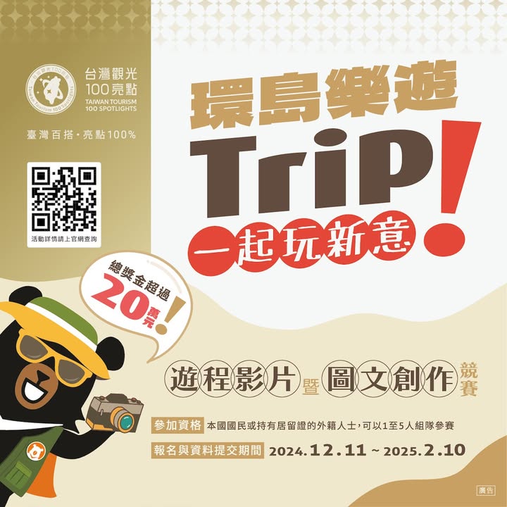 #台灣觀光100亮點 x 環島樂遊Trip!「遊程競賽」即日起開跑囉,最高可獲得3萬元獎金 是時候把台東好玩的私房行程秀出來了! 快來報名參加就有機會把獎金帶走唷 投稿期間:113/12/11 - 114/2/10 參賽組別:遊程影片組、旅遊圖文組 用影片或是圖文的方式投稿參加都可以! #台東 #台東景點 #台東旅遊 #台東旅行 - 2024-12-13