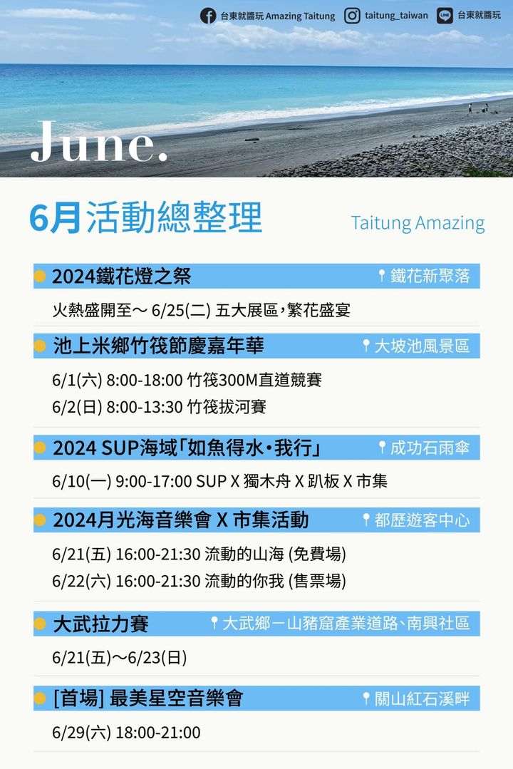 【六月活動月曆】好玩又好康!各式活動、景點還有美食等你來 住宿還有機會抽到旅遊獎勵金6萬6 本月重大活動 ️ 首場最美星空音樂會|6/29 ️ 月光海音樂會 | 6/21-22 ️ 2024鐵花燈之祭|只到 6/25 夏日來台東,吃喝玩樂就醬玩! 不僅有山林秘境,還有水上活動 想要慢生活還是刺激體驗台東全都有 #台東 #台東景點 #活動 #台東就醬玩 【Nga'ayho】你好,東海岸 臺東縣池上鄉公所 愛來武遊 大武鄉公所 臺東縣關山鎮公所 - 2024-05-29