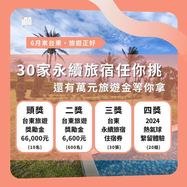 想來一場旅行,又不想給地球帶來太多負擔嗎?來台東玩就對啦 六月來玩還有機會拿到最高6萬6加碼獎金唷 . 台東縣府特選30家特色 #永續旅宿 讓你在開心玩樂的同時,還能響應永續作為 即日起至6/30來台東住宿 還有機會抽多樣好禮! 心動不如行動 立刻查詢永續旅宿有哪些https://www.visit-ourtaitung.com/ 六月獎勵活動辦法,請看https://www.tttravel.org/ #SDGsInn行動方案 #永續觀光 #台東 #台東旅遊 #台東旅行 #台東住宿 #台東就醬玩 #旅遊補助 - 2024-05-31