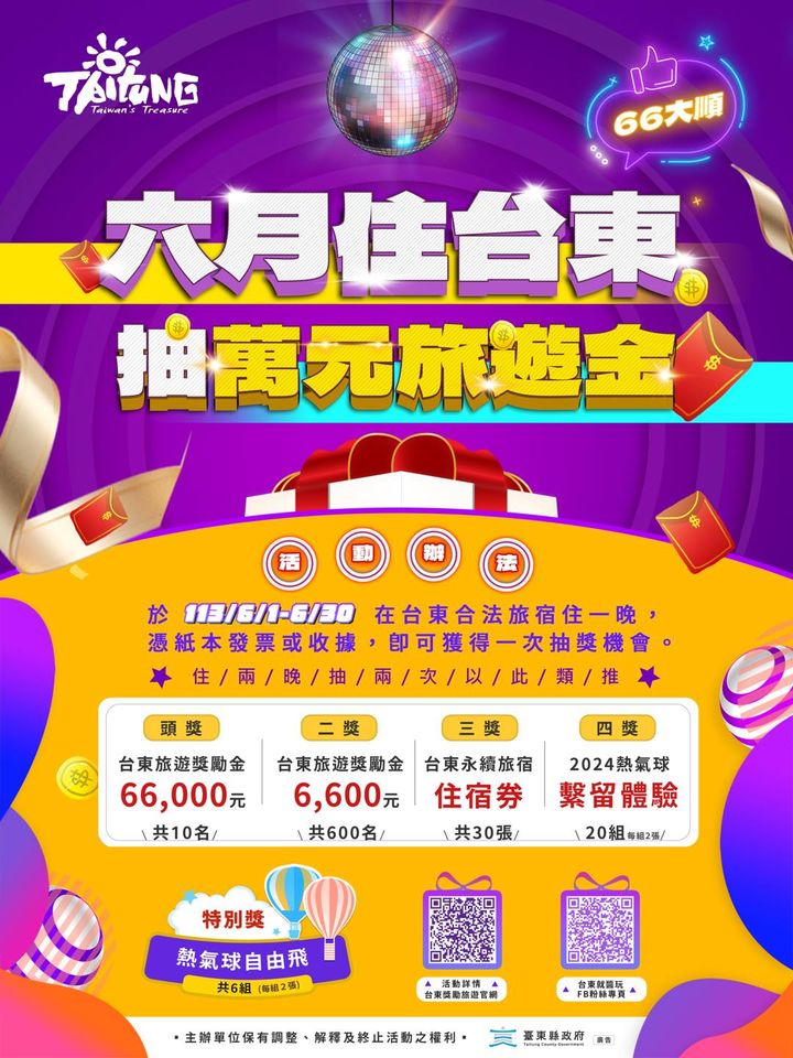 把握機會「6月住臺東抽萬元旅遊金」活動已經快過一半了 至6月底前入住臺東合法旅宿1晚,即獲得1次抽獎機會 住越多天,越多機會抽中大獎! 活動將抽出熱氣球繫留、自由飛等體驗 人生必做清單絕對不能錯過高空俯瞰台東美景吧? 還有66,000、6,600旅遊獎勵金以及30家永續旅宿住宿券等豐富獎項 明晚就來台東住一晚吧 更多詳細活動辦法https://www.tttravel.org/ - 2024-06-13