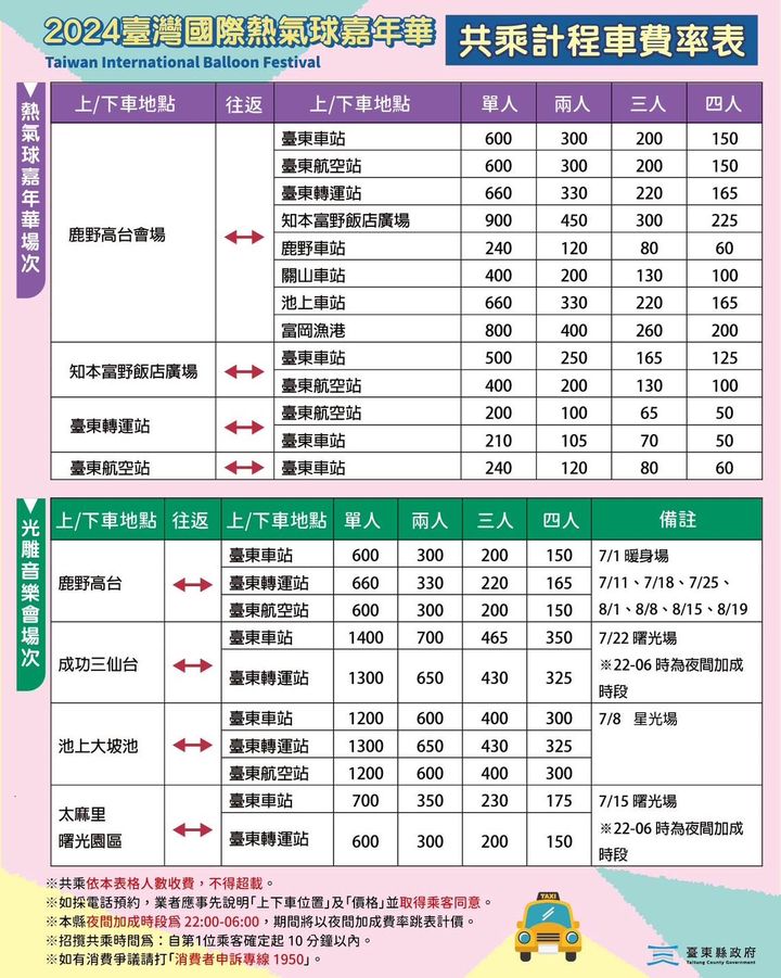 ⊹熱氣球嘉年華「共乘計程車資訊」來囉!!⊹快揪親朋好友共乘計程車 越多人,越划算 一起上鹿野高台吧~~~ 不用等公車,快速又方便 別等了,快衝啊!!! 鹿野高台禁止臨停. 請多多搭乘大眾運輸工具 圖表票價為單趟價格 2024臺灣國際熱氣球嘉年華 時間:7/6(六)-8/19(一) 地點:臺東鹿野高台 - 2024-06-15