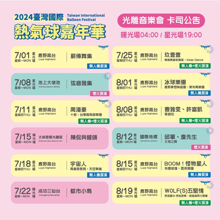 ⊹臺灣國際熱氣球嘉年華「光雕音樂會卡司公告暨煙火場次調整」⊹ 為了準備更好的卡司給大家 我們進行活動調整 推出【超級豪華】的光雕卡司陣容~~ 除了周周(Nick 周湯豪)跟五堅情official之外 玖壹壹、 麋先生 MIXER、宇宙人 、icyball 冰球樂團、邱軍Kui 、Boom!怪物星人 還有雙台語金曲曹雅雯 + 許富凱 Henry Hsu 超炸的陣容這根本是跨年卡司了吧 真的是讓小編超期待 2024臺灣國際熱氣球嘉年華 時間:7/6(六)-8/19(一) 地點:臺東鹿野高台 - 2024-06-09