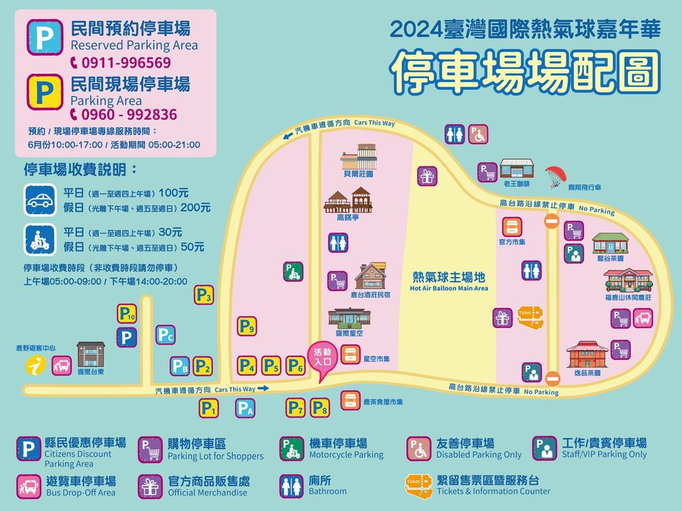 ⊹熱氣球嘉年華「民間停車場資訊」來囉!!⊹為提供更多的停車空間、更好的旅遊服務,今年熱氣球停車持續由民間辦理,現場提供逾3000個停車空間,分別有現場付費、預約兩種停車場,方便遊客到場賞球。 預約線上付費停車場 場地:PA、PB、PC 計3個場地 客服專線:0911-996569 【6月14日AM09:00正式開賣】 預約網址 https://www.luyepark.com.tw/ 現場付費停車場 場地:P1-P10 計10個場域 客服專線:0960-992836 小編提醒:如果部分現場停車場滿場,請務必依循工作人員 指示停放他處停車場呦~ 預約/現場停車場專線服務時間 6月份:10:00-17:00 7-8月份活動期間專線延長為05:00-21:00 入園清潔費收費說明 上午時段(05:00-09:00) 下午時段(14:00-20:00) 小編提醒:汽車與機車的收費方式不同~~ 汽車時段收費如下: 平日上、下午時段各為:100元 鹿野光雕(週四)下午場&週五-週日上、下午時段各:200元 機車時段收費如下: 平日上、下午時段各為:30元 鹿野光雕(週四)下午場&週五-週日上、下午時段各:50元 小編的叮嚀:友善停車場將提供孕婦及年長者(行動不便長者)及身心障礙朋友優先停放,但是友善停車場車位有限,如果友善停車場滿場,請務必依循工作人員指示停放他處停車場呦 - 2024-06-06