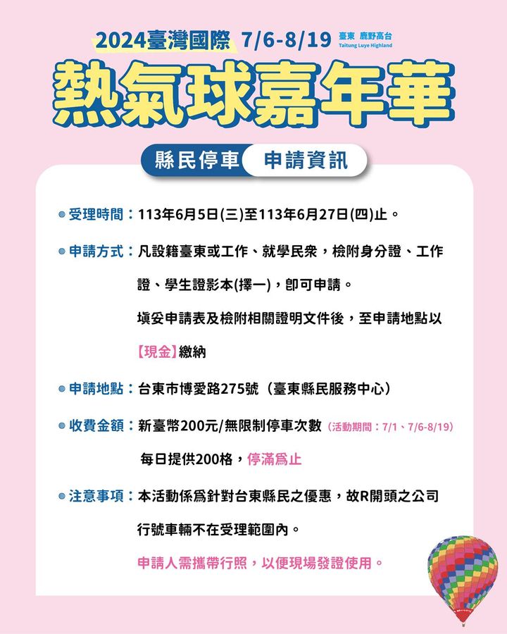 2024臺灣國際熱氣球嘉年華 縣民優惠停車申請來摟◍受理時間:113年6月5日(三)至113年6月27日(四)止。 ◍申請方式: .凡設籍臺東或於臺東縣內服務、工作、就學者,檢附「身分證或工作證或學生證等相關證件」以及「本人或家人汽車行照」 .填妥申請表及檢附相關證明文件,至臺東縣民服務中心,即可申請 .以現金繳納【只收現金哦!!】 ◍申請地點:台東縣台東市博愛路275號(臺東縣民服務中心) ◍收費金額及方式: .新臺幣200元/無限制停車次數(活動期間:7/1, 7/6-8/19) .車位每日提供200格,停滿為止 ◍注意事項 .車籍不限設籍於臺東,租賃車及營業車輛不適用本次優惠 .申請人請攜帶行照,以便現場發證明使用 2024臺灣國際熱氣球嘉年華 縣民停車申請資訊 https://balloontaiwan.taitung.gov.tw/zh-tw/event/5650 #相關申請及注意事項請參閱「縣民優惠停車申請表」 - 2024-06-04