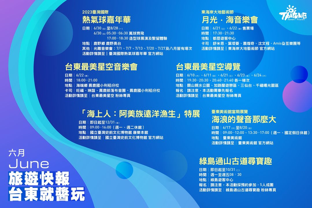 #六月旅遊快報 #歡迎更新2023臺灣國際熱氣球嘉年華 日期|6/30(五)至8/28(一) 6/30(五)5:30-6:30萬球齊飛、17:00-18:30造型球展演及繫留體驗 地點|鹿野鄉 鹿野高台 其他|光雕音樂會:7/1、7/7、7/13、7/20、7/27及八月皆有場次 活動詳情請至|臺灣國際熱氣球嘉年華 官方網站 台東最美星空音樂會 日期|6/22(四) 時間|18:00-21:00 地點|海端鄉 霧鹿國小利稻分校 卡司|旺福、琳誼、霧鹿部落布音團、霧鹿國小利稻分校 活動詳情請至|台東最美星空 粉絲專頁 台東最美星空導覽 日期|6/10(六)、6/11(日)、6/21(三)、6/23(五)、6/24(六) 時間|19:30-20:30、20:40-21:40 各一梯次 地點|關山親水公園、加路蘭遊憩區、三仙台、千禧曙光園區 報名|請注意,本活動需事先報名 活動詳情請至|台東最美星空 粉絲專頁 綠島過山古道尋寶趣 日期|即日起至10/31(二) 地點|綠島遊客中心 報名|請注意,本活動採預約參加,5人成團 活動詳情請至|綠島過山古道尋寶趣 粉絲專頁 東海岸大地藝術節 月光•海音樂會 日期|6/21(三)、6/22(四)-售票場 時間|17:30-21:30 地點|都歷遊客中心 卡司|舒米恩、葉璦菱、蕭煌奇、沈文程、Amis旮亙樂團等 活動詳情請至|東海岸大地藝術節 官方網站 「海上人:阿美族遠洋漁生」特展 日期|即日起至12/31(日) 時間|9:00-16:00(週一、週二休館) 地點|國立臺灣史前文化博物館 康樂本館 活動詳情請至|國立臺灣史前文化博物館 官方網站 臺東美術館當期展覽:海浪的聲音那麼大 日期|6/17(六)至8/20(日) 時間|9:00-12:00、13:30-17:00(週一、國定假日休館) 地點|臺東美術館 活動詳情請至|臺東美術館 官方網站 - 2023-05-26