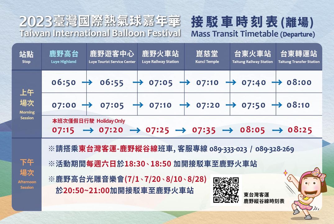 【交通接駁資訊】2023臺灣國際熱氣球嘉年華即將開跑 各位球迷朋友久等了!!! 接駁車資訊來囉~ 接駁車分為「大會接駁」及「台灣好行」兩種! 不僅是有配合活動時間增加接駁班次! 從鹿野高台回程的時刻表也有特別調整: 1⃣️ 針對鹿野高台光雕音樂會的接駁時刻 2⃣️ 因天氣因素取消活動的接駁時刻 大家一定要看清楚標題唷 【大會接駁車6/30-8/28】 台東市區鹿野高台 上午場 | 從04:10至05:20在台東轉運站「第8月台」發車,假日則加開一個班次 下午場 | 請參考「東台灣客運-鹿野縱谷線」時刻表 針對鹿野高台光雕音樂會及每週六日也將依據火車時刻表加開循環接駁車,從鹿野火車站至鹿野高台 鹿野高台台東市區 上午場 | 從06:50開始至08:10,假日也將加開一個班次 下午場 | 請參考「東台灣客運-鹿野縱谷線」時刻表 針對鹿野高台光雕音樂會及每週六日將加開接駁車至鹿野火車站 接駁車票價 臺東轉運站、臺東火車站鹿野高台 全票75元 優待票38元 (6-12歲及65以上,或有身心障礙手冊者) 鹿野火車站鹿野高台 全票25元 優待票13元 (6-12歲及65以上,或有身心障礙手冊者) 【台灣好行/東台灣客運_鹿野縱谷線】 完整時刻表及票價查詢:https://reurl.cc/AAjqeY #2023臺灣國際熱氣球嘉年華接駁車資訊 #歡迎搭乘大眾運輸工具 #大家一起減碳遊台東 - 2023-06-20