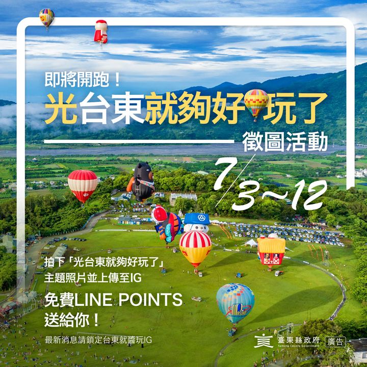 準備好了嗎?「光台東就夠好玩了」徵圖活動7/3-7/12即將開跑來台東拍下美食、美景的好玩照片並上傳IG,就能免費拿LINE POINT!🪙 詳細活動資訊敬請鎖定台東就醬玩IG,千萬不要錯過! 台東就醬玩IG追蹤起來https://www.instagram.com/taitung_taiwan/ 活動期間:7/3-7/12 投稿方式: 1. 拍攝以「光台東就夠好玩了」為主題的相片 2. 以貼文形式上傳於自己的Instagram帳號,並標註hashtag 「#光台東就夠好玩了」即完成投稿。 入選名單公布:預計於7/24公布於台東就醬玩IG 更多台東旅行資訊~ 旅行台東APP (iOS)http://tour.taitung.gov.tw/go/APdRqbGy 旅行台東APP (Android)http://tour.taitung.gov.tw/go/MQr6vrBZ 台東旅遊網https://tour.taitung.gov.tw/ - 2023-06-29