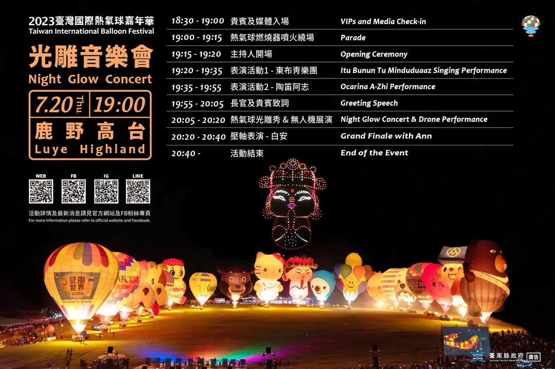 【鹿野高台光雕音樂會】7月20日(四) 晚上19:00-20:40 13顆國內外熱氣球 700台無人機群飛展演 創作才女 白安ANN 臺東延平及海端青年 東布青 - 巴尼青年空間 陶笛游學志領隊帶來最精彩的音樂演奏 陶笛阿志 - 游學志 Ocarina A-Zhi 粉絲團 最受期待的熱氣球光雕音樂會 最美麗的夜空相隨 給你最嗨開場飛行員噴火繞場 絕對不能錯過的鹿野高台光雕音樂會️ 【接駁車資訊】 https://reurl.cc/51ayAq 【直播傳送門】 https://reurl.cc/2L3We9 提醒 7/20、8/10、8/28因光雕音樂會 下午場繫留體驗及造型球展演將提早結束 貼心提醒夜晚燈光昏暗,請大家記得隨身攜帶手電筒 現場禁止使用空拍機,未經申請者,違者最高可罰款100萬元。 光雕時間可能因天候因素提前或延後開始 快加入熱氣球LINE官方帳號,隨時查詢最新消息 https://lin.ee/1ftcKtA #創作才女白安 #在地青年東布青樂團 #陶笛游學志 #卡林巴琴張思絲 #小提琴丁詩涵 #大提琴林季謙 #鹿野國小18人 #太平國小7人 #國立台北教育大學附設國民實驗小學35人 #鹿野高台光雕音樂會 #2023臺灣國際熱氣球嘉年華 - 2023-07-11