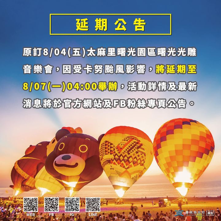 延期公告因受卡努颱風外圍環流影響,考量海邊長浪及遊客安全,原訂8/04(五)太麻里曙光園區光雕音樂會,將延期至8/07(一)舉辦! 造成您的不便,敬請見諒 #2023臺灣國際熱氣球嘉年華 - 2023-07-31