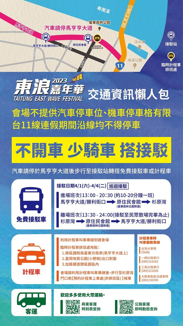 知道是你們要的,所以這篇很仔細【東浪嘉年華feat.尬電 - 交通接駁資訊】 不開車 少騎車 搭接駁 東浪即將來襲 準備好到杉原灣跟我們一起享受音浪衝擊了嗎 但是!怎麼到活動現場比較好呢 活動交通懶人包來了~ |活動期間杉原灣僅開放工作車輛及民眾機車出入| |台11線連假期間沿線均禁止停車| 汽車停車資訊 —————————— 馬亨亨大道開放路邊停車 免費接駁車資訊 —————————— 進場班次 | 13:00 —20:30 【巡迴接駁】 // 馬亨亨大道/勝利街口原住民會館(臺東森林公園對面)杉原灣// 【進場末班車】 // 20:30馬亨亨大道/勝利街口發車 // 離場班次 | 13:30至24:00 【巡迴接駁】 //活動會場原住民會館(台東森林公園入口對面)馬亨亨大道/勝利街口// //接駁至民眾散離場完畢為止// 大眾運輸資訊 —————————— 公路客運即時動態查詢https://reurl.cc/jl9z2D 興東客運https://sdbus.com.tw/ 注意事項 活動因逢連假,恐車流壅塞,為維護台11線交通順暢,公路總局特別嚴禁台11線路邊停車,建議請開車前來的朋友停至大會指定停車區,轉搭免費接駁車。 ️活動期間馬亨亨大道開放路邊停車 ️台11線禁止路邊停車 ️請大家多多利用免費接駁車 ️活動期間人車較多注意安全 ️2023東浪嘉年華feat尬電 ️交通接駁資訊 - 2023-03-25