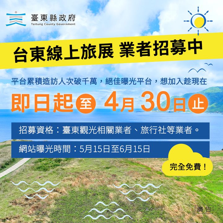 【2023台東夏季 #線上旅展 】台東觀光相關 #參展 業者 #招募 中!2023台東線上旅展即將開跑,歡迎台東在地業者一同共襄盛舉! 為持續推廣國旅市場,臺東縣政府預計將於5/15-6/15透過台東觀光旅遊網辦理2023台東線上旅展,除提供在地業者產品露出外,亦提供官方社群等相關平台宣傳曝光。 本次旅展將區分為「遊程類」及「其他類(旅宿、伴手禮等產品)」兩種類型,歡迎各位業者立即報名,踴躍提供5-9月的主打行程、商品,一同共襄盛舉! ➡ 「遊程類」報名連結:https://reurl.cc/a1gzdQ ➡ 「其他類」報名連結:https://reurl.cc/ml2XRV ➡ 報名資格:臺東觀光相關業者、旅行社等業者 ➡ 報名期限:即日起至4/30 ☎ 報名相關問題請洽:03-8334774 分機20 康小姐 - 2023-04-15