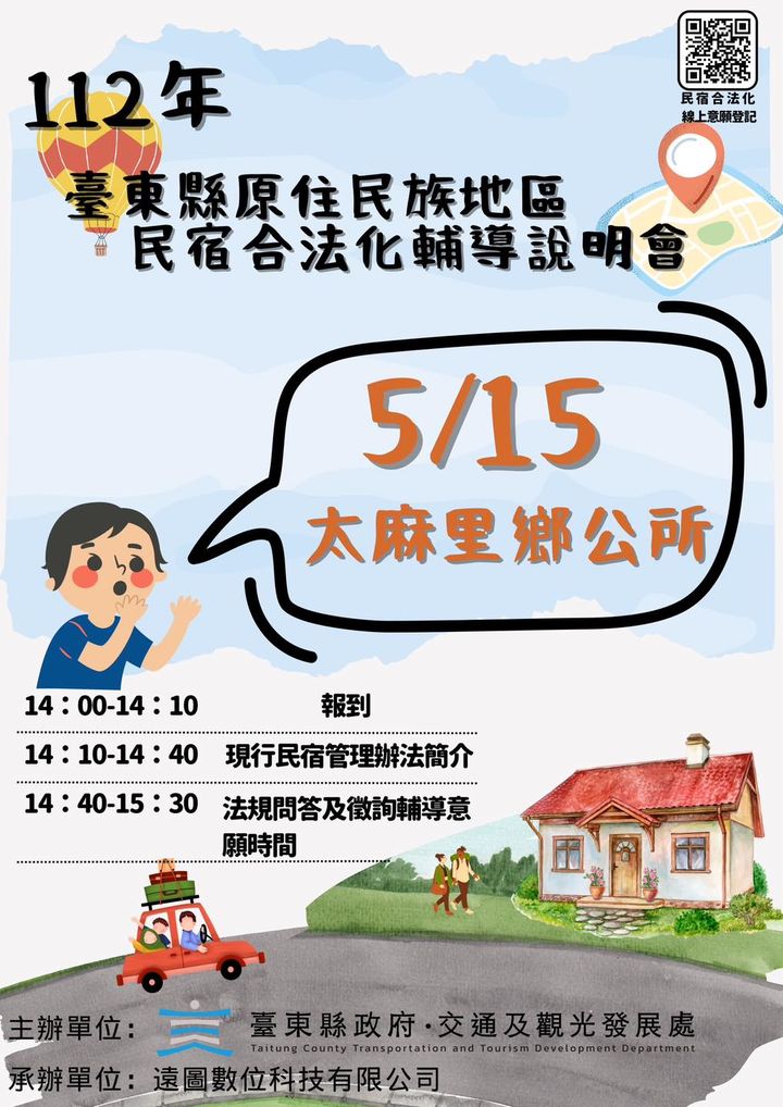 原住民族文化一直以來都是臺東縣重要觀光旅遊特色,部落擁有絕佳美景、特色文化、以及各種在地性體驗行程!今年將在5月15日、5月16日及5月17日連續三日辦理民宿合法化輔導說明會,歡迎有興趣的民宿業者參加哦! - 2023-04-26