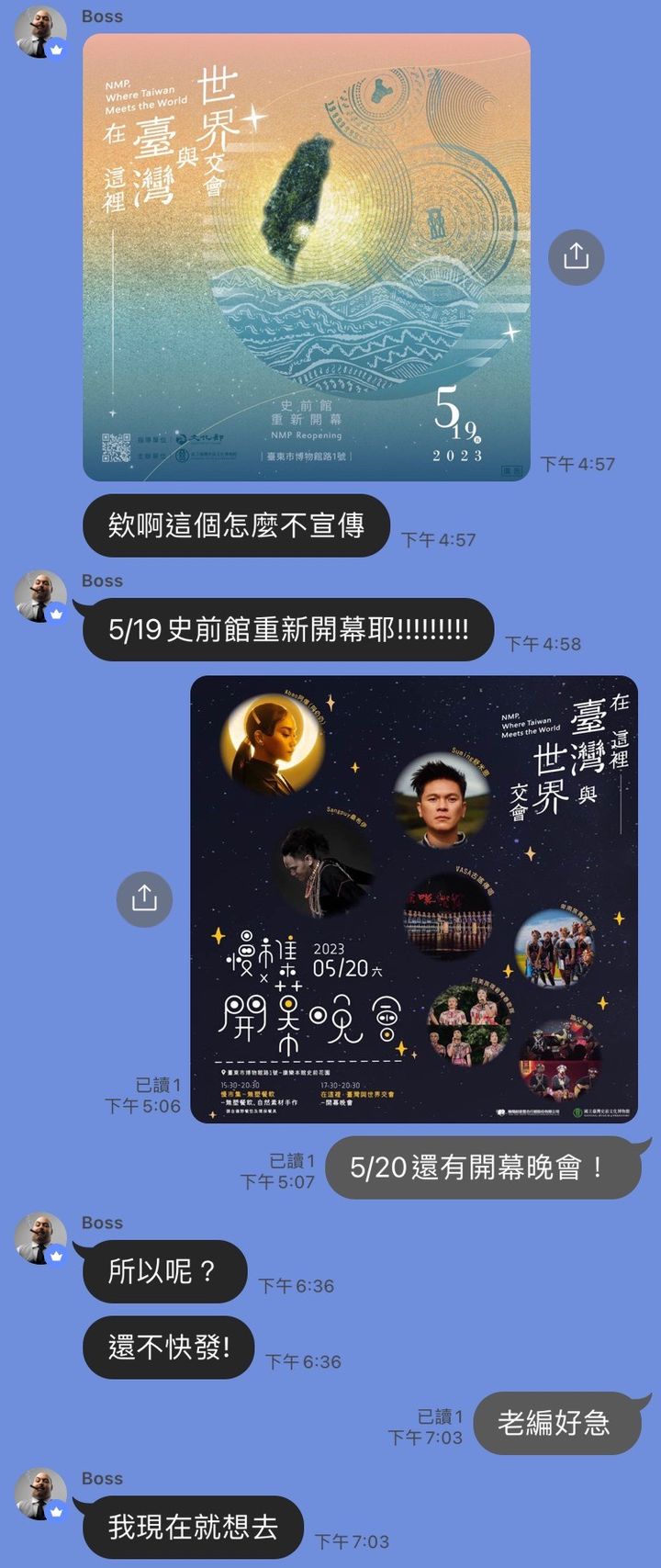 國立臺灣史前文化博物館 National Museum of Prehistory你看我們老編好急,5/19史前館重新開幕如果看到他不要意外喔!5/20他應該也會衝第一去市集跟開幕晚會。— 5/19(五)史前館重新開幕 — 相約到康樂本館,一起探索那個熟悉卻又更加嶄新的史前館。 — 5/20(六)晚會資訊 — 時間:17:30-20:30(15:30現場市集活動開始) 地點:史前館.史前花園 - 2023-05-02