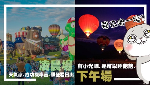 【第一次衝熱氣球..求解】網路上流傳的一生一定要在台灣做的一件事️ 就是去台東鹿野高台看一次熱氣球 但是️要選擇上午場還是下午場呢 上午場要很早起很自虐~~ 一大早就要出發!! 尤其是想繫留體驗的朋友你大概半夜就要到了 不過!不過! 凌晨的鹿野高台【不塞️不熱️不必等️ 】- 再加上早上展球的成功機會比較大 這個太吸引人了 可是...下午場有絕美的小光雕... 小光雕很漂亮 接近黃昏的小光雕搭配上雲海真的美的不要不要的 你們會選擇哪一場呢 - 2023-05-23