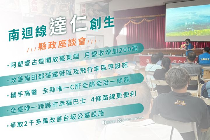 【南迴觀光新亮點 打造達仁地方創生品牌】達仁有保存原始海岸森林的 #阿塱壹古道 #土坂溫泉、珍貴的 #排灣族文化 以及咖啡、紅藜等特色農產品。 縣府與達仁鄉公所攜手努力,爭取6千萬經費,近年來開始發展溯溪、海岸露營、部落文化、生態登山等體驗活動,透過永續觀光模式,打造達仁地方創生品牌,再創南迴觀光新亮點。 ⛰ #阿塱壹古道開放臺東端_月營收增加200萬 阿塱壹古道原本只能向屏東縣政府申請進入,經過縣府努力協調,109年成功爭取到阿塱壹古道台東端每日50名的入山配額,累計至今已有超過萬名旅客來訪,為當地增加50個以上的就業機會,更帶來每月200萬的營收。 ⛰ #改善南田部落露營區及飛行傘區等設施 縣府補助900萬,改善達仁產業推廣中心、南田露營區、飛行傘、自行車道以及社區指標導引系統等設施。 ⛰ #攜手高醫_全縣唯一C肝全篩全治一條龍 縣府與高醫合作,在達仁鄉衛生所開設C肝治療門診,是全縣唯一篩檢治療一條龍模式的鄉鎮。自去年開設至今,已有4位個案完成治療且完全檢測不到C肝病毒,成功痊癒。 ⛰ #全臺唯一跨縣市幸福巴士_4條路線更便利 達仁鄉內目前已有4條幸福巴士路線營運中,去年更開發全國第一條跨縣市的幸褔巴士路線,讓鄉親可以就近到屏東枋寮就醫或採買,大大提升生活便利性。 ⛰ #爭取2千多萬改善台坂公墓設施 達仁鄉內墓地不足,縣府積極協助爭取經費,讓公所可以在台坂興建納骨塔,增加560個骨灰櫃位,並且整建美化周邊環境。