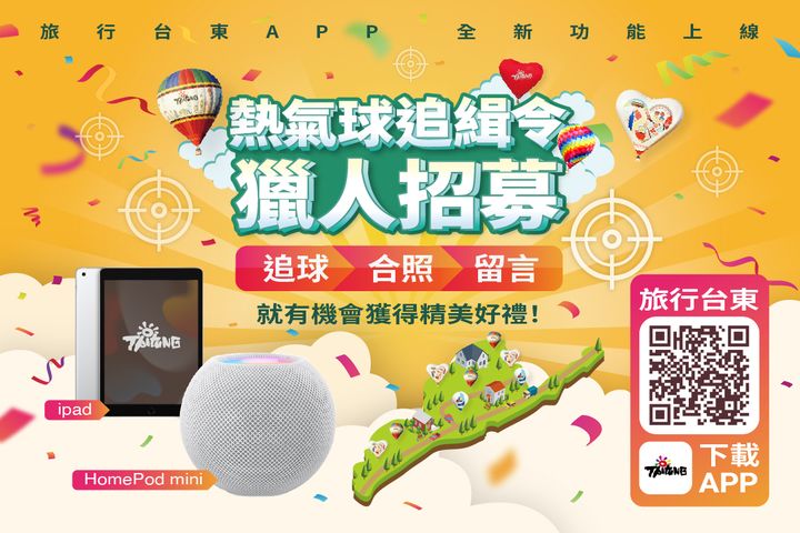 #熱氣球追緝令#抓熱氣球抽好禮 #追球獵人就是你 熱氣球們逃跑啦 追球獵人全台招募中 熱氣球嘉年華即將開幕 不小心放跑了好多熱氣球 它們飄散到各地,把自己藏在寶箱裡 快快打開旅行台東APP,幫我們找回它們! 還有機會獲得豐厚懸賞獎勵 獎勵一 10.2吋64GB iPad一台 獎勵二 HomePod mini一台 獎勵三 全聯禮券1,000元五份 特別獎㊙三十份 辦法如下 1. 下載旅行台東APPhttp://tour.taitung.gov.tw/go/MQr6vrBZ 2. 點擊APP首頁🕹進入「熱氣球追緝令」遊戲 3. 完成追捕後至「我的背包」與熱氣球來張合照 4. 於此篇貼文下留下與熱氣球的合照,標註一位好友,例如:「@XX_XXX 來當追球獵人吧」 5. 公開分享此篇貼文,號召更多獵人一同參與吧 完成以上步驟即可獲得抽獎資格 務必注意是跟「AR熱氣球」進行合照才有抽獎資格 特別加碼 若是在台東追捕熱氣球,讓AR熱氣球與「台東景點」合照(譬如多良車站、熱氣球嘉年華、鐵花村) 標註一位好友,並在留言處留言「@XX_XXX 來當追球獵人吧 #我在台東抓球」 有機會獲得神秘特別獎 可重複留言,但需標註不同朋友 (請標記認識的人 勿造成他人困擾) 留言截止時間:7/11(一) 23:59前 7/12公布得獎者,並陸續留言告知 得獎人需於7/18(一)18:00前私訊小編「姓名、電話、寄送地址」逾時視同放棄得獎資格 詳細活動辦法請看留言 - 2022-07-03