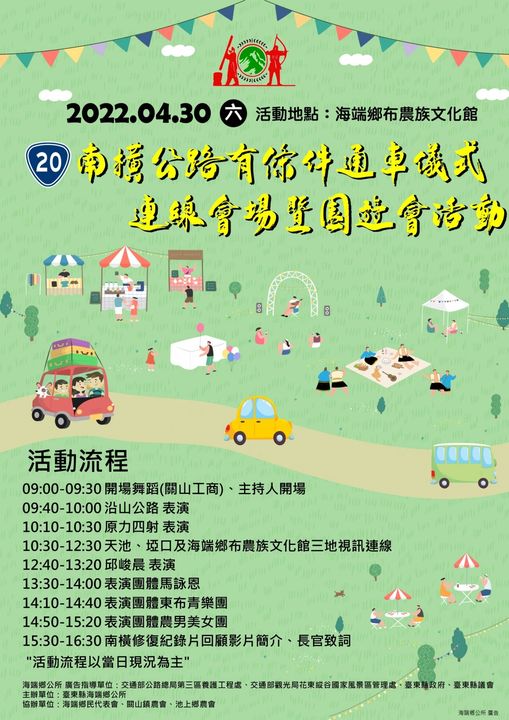 醬玩小編報活動!#南橫公路大事記 你們知道嗎?南橫公路睽違12年將重現新生命的歷史! 海端鄉位於南橫公路的出/入口,與南橫公路相互依存,除了交通、觀光與經濟產業傳輸功能之外,對布農族人來說,這條路也拉近 #臺東布農族 與 #高雄布農族 的距離,穩固siduh(氏族)、kaviaz(盟友)、mavala(姻親)的基本關係,更是牽起兩塊流域情感的重要支線。相信這條路的通行,也將重新找回每個人的回憶。 - 南橫公路有條件通車儀式連線會場暨園遊會活動 活動日期|4/30 活動時間|0900-1630 活動地點|海端鄉布農族文化管 #台東不只是台東 - 2022-04-18