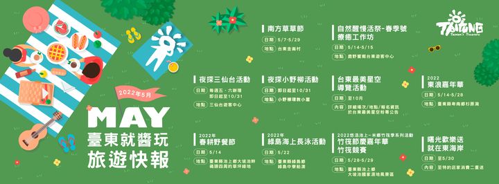 台東就醬玩5月旅遊快報5月的台東怎麼玩? 跟著醬玩小編看下去就對了! 從野餐、長泳到觀星活動, 多元的臺東,等著你來探索! 眾多活動趕快筆記起來一起東漂吧! 醬玩小編提醒大家, 出門在外要遵守防疫規定哦! ||活動資訊|| 南方草草節 ‧活動期間:5/7-5/29 ‧活動地點:台東金崙村 ‧活動內容:5/7開幕日1400-1800將於金崙車站旁「LI.KA CAFE 力卡珈琲」舉辦開幕音樂會&南方市集 自然醒慢活祭-春季號|療癒工作坊 ‧活動期間:5/14-5/15 ‧活動地點:鹿野饗嚮台東遊客中心 ‧活動詳情參考:https://reurl.cc/QjvgdZ 夜探三仙台活動 ‧活動期間:每週五、六辦理(即日起至10/31) ‧活動地點:三仙台遊客中心 ‧活動詳情參考:https://reurl.cc/NAXV0n 夜探小野柳活動 ‧活動期間:即日起至10/31 ‧活動地點:小野柳環教小屋 ‧活動詳情參考:https://reurl.cc/q5mQLE 台東最美星空導覽活動 ‧活動期間:至11月 ‧活動詳情參考:https://reurl.cc/0pD799 2022東浪嘉年華 ‧活動期間:5/14-5/28 ‧活動地點:臺東縣卑南鄉杉原灣 ‧活動詳情參考:https://reurl.cc/2ZbpYv 2022春耕野餐節 ‧活動日期:5/14 ‧活動地點:臺東縣池上鄉大坡池畔碼頭四周的草坪綠地 ‧活動詳情參考:https://reurl.cc/vd5VvL 2022年綠島海上長泳活動 ‧活動日期:5/22 ‧活動地點:臺東縣綠島鄉綠島中寮船澳 ‧活動詳情參考:https://reurl.cc/A7go2Y 2022悠活池上-米鄉竹筏季系列活動『竹筏節慶嘉年華』竹筏競賽】 ‧活動期間:5/28-5/29 ‧活動地點:臺東縣池上鄉大坡池國家濕地風景區 ‧活動詳情參考:https://reurl.cc/NAXVl6 曙光歡樂送.就在東海岸 ‧活動期間:至5/30 ‧活動內容:凡是至特約店家消費即可參與【消費折扣送】和【消費好禮送】二重送: 【消費折扣送】:在特約店家消費滿500元以上,就能直接上網登錄現金回饋,折數從5折到85折不等。 【消費好禮送】:至特約店家消費滿300元即可自行上網登錄,參加月月抽好獎的活動,獎品總價值超過新臺幣30萬元以上,包含有旅行社套裝遊程、部落好禮、在地手作伴手禮等。 - 以上資訊來源: 台東觀光旅遊網(https://reurl.cc/KpMlEm) 各活動粉專 以上資訊整理至4/26,如有資訊更新將於貼文內更新 #台東就醬玩 #台東景點 #我東漂了那你呢 #東漂 #台東 #慢遊台東 - The travel information of May is coming. Be sure to take personal precautions and complete vaccination ASAP. - 2022-04-27