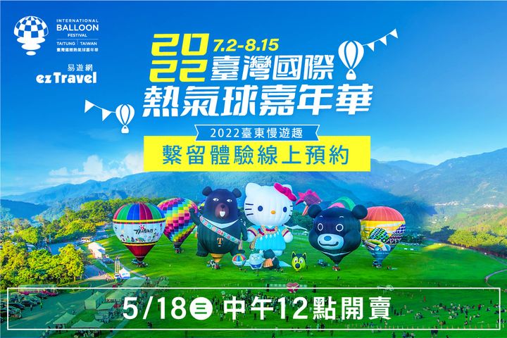 【想見你!繽紛熱氣球點點名】台灣國際熱氣球嘉年華蓄勢待發,今年有超過20顆外國造型球、搭配11顆台東隊與你見面,想看日本「熊本熊」、還是美國搖滾樂之王「貓王」球,忍不住跟著一起嗨唱Baby shark, doo doo doo…的「鯊鯊球」,#追球日誌搶先公布啦,快快安排你的台東之旅吧! 臺灣國際熱氣球嘉年華-Taiwan International Balloon Festival 時間|7.2-8.15 地點|鹿野高台 官方網站|http://balloontaiwan.taitung.gov.tw/ - 2022-06-19