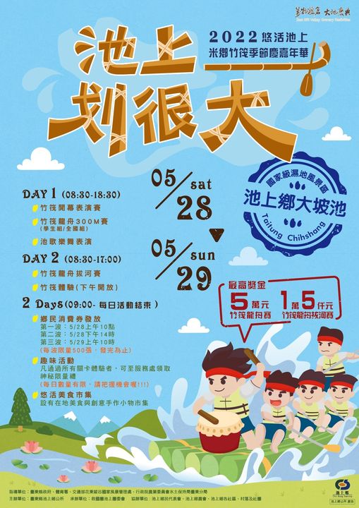 2022悠活池上米鄉竹筏季節慶嘉年華 活動快報活動時間:5月28日至5月29日 活動地點:臺東縣池上鄉大坡池國家級濕地風景區。 活動內容:第一天主軸活動為竹筏300M直道競速與池聲樂舞表演除有在地社團表演外,更邀請聲林之王吱吱郭芝吟與太陽下山等團隊演出,超強卡司不可錯過;第二天為熱鬧刺激的竹筏拔河競賽。 - 還有闖關活動與美食市集, 邀請全國民眾參與,在地獨特運動競賽與熱門好玩的系列活動。 - 因應遵守中央防治嚴重特殊傳染性肺炎作業,本活動將於管制路口設置入口體溫防疫站,敬請參與民眾配合相關防疫作業。 詳細活動報名資訊 https://reurl.cc/ZAV0VQ 臺東縣池上鄉公所 - 旅遊不忘防疫,隨時保持手部清潔、配戴口罩、隨身攜帶水瓶和餐具 - 2022-05-24