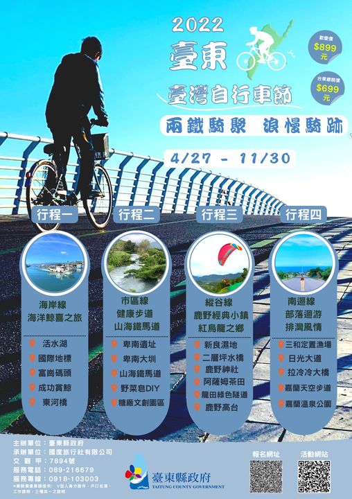 ♂2022臺灣自行車節 ~「兩鐵騎聚,浪慢騎跡」乘風速度,浪慢輕遊,臺東山海自行車路線,領略台東日常卻不平凡的美。 - 腳踏車可以去哪裡? 夏日少年巷口買冰棒,青春的站踏搖擺追騎。 記憶可以升級~ 不用洪荒之力 只需騎心鞋力。 慢活台東 漫遊自行 太平洋的鮮活跳上視野,縱谷線靜謐踏入遊田,南迴不膚淺新探秘。 有一種台東是緩慢是深飲,時間可以浪漫,人文風土可以外帶,我們有全球最好客的居民成為您的接待,沉浸在臺東「真」實、「善」意、「美」好的無可取代。 - 臺東縣政府辦理的「兩鐵騎聚,浪慢騎跡」有專業導遊為您導覽解說,全程使用電動輔助自行車,讓平路輕鬆、爬坡更順暢,享受美景零負擔,體驗臺東更輕鬆,即日起至11/30止,把握機會,心動馬上行動! - 活動網站:https://kingdomtravelgo.com 報名網址:https://reurl.cc/p1vGQb - 大家作伙來騎卡打車 共創好騎跡就底加! 活動諮詢及報名請洽國度旅行社有限公司。 報名專線:089-221679 - 旅遊不忘防疫,隨時保持手部清潔、配戴口罩、隨身攜帶水瓶和餐具 - 2022-05-24